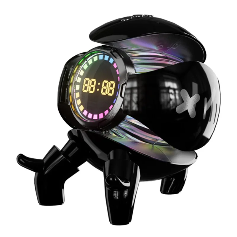 This futuristic AI-powered robot speaker features deep bass, RGB lights, and a built-in FM radio with an alarm clock. Equipped with a Bluetooth 5.1 chip and 1800mAh battery, it offers crystal-clear sound and smart voice interaction. This gadget promotes democratie in home automation, providing everyone with a high-tech personal assistant and premium audio experience.